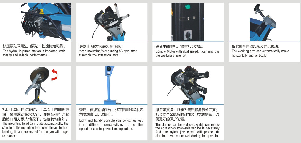 4) Es wird mit dem hydraulisch angetriebenen Wagen ausgerüstet, der den Reifen herstellt, der den Reifenwechsler ohne Arbeitskräfte weitergeht.